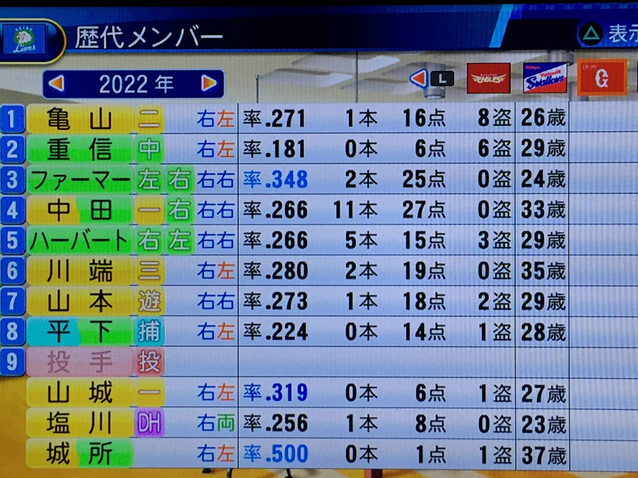 問題は野手で、捕手は1回目に平下取ってから誰も取ってないから、そろそろやばい。山城、亀山、塩川、盛田と内野の核になりうる選手はいるが、どれも成績に迫力がかける。