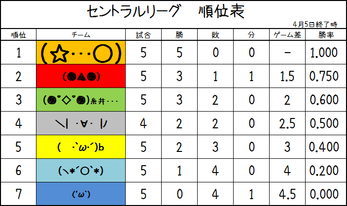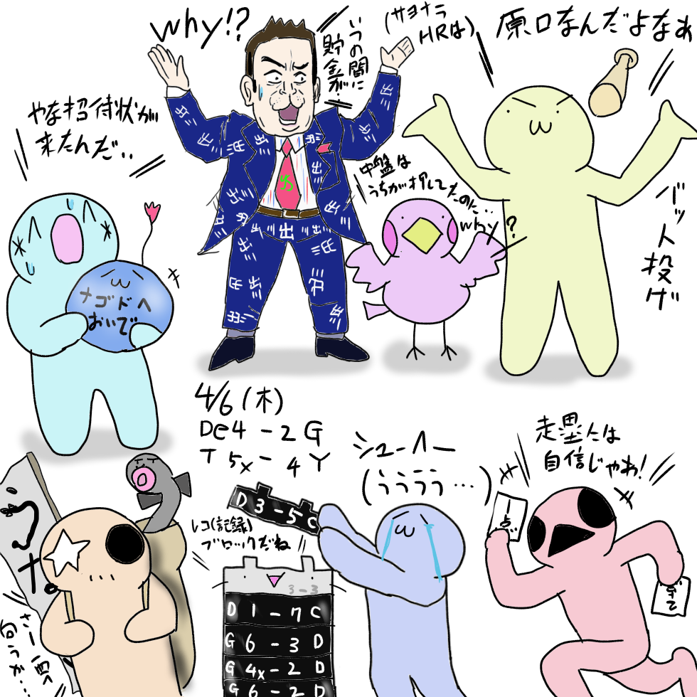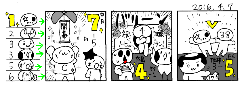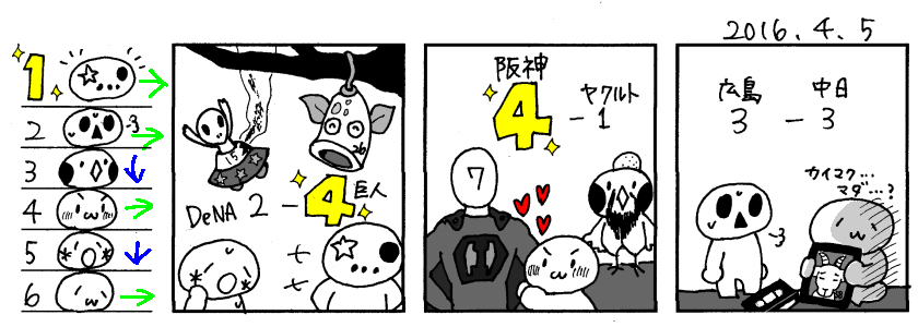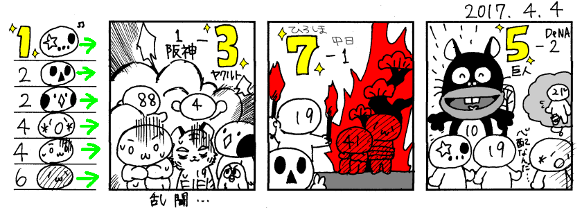 4/7(金) 中 7-5 D 神 3-5 巨 広 4-1 ヤ オ 4-2 日 西 2-4 ソ