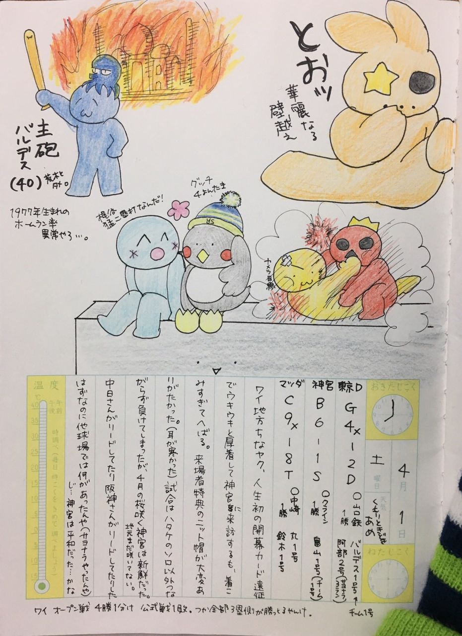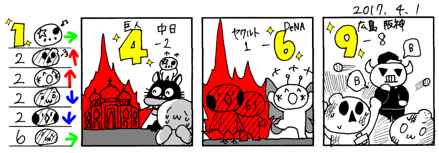 4/1(土) 巨 4-2 中 広 9-8 神 ヤ 1-6 D 日 3-1 西 ソ 4-1 ロ オ 4-13 楽