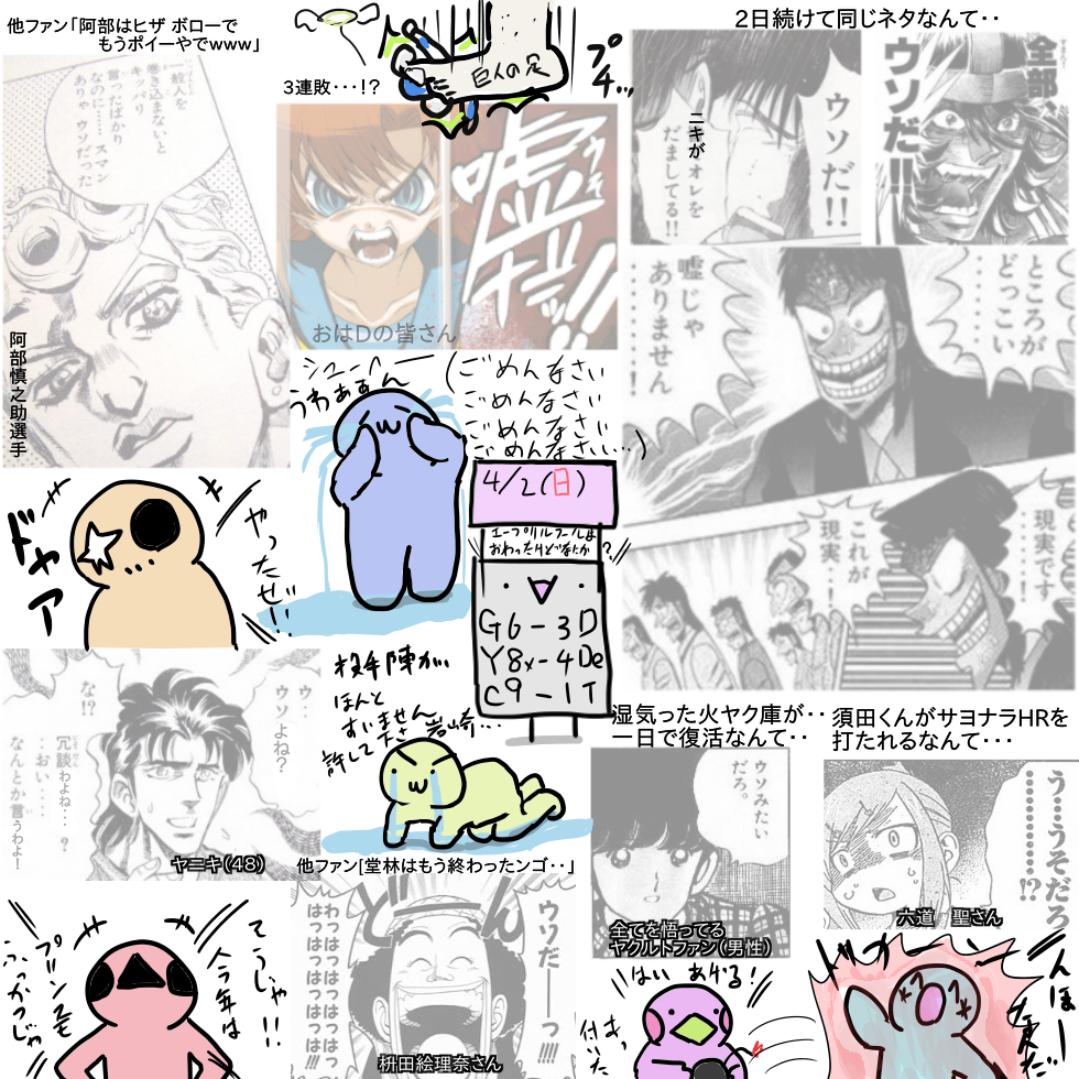 4/2(日) 巨 6-3 中 広 9-1 神 ヤ 8-4 D 日 3-6 西 ソ 5-3 ロ オ 4-5 楽