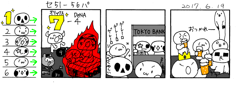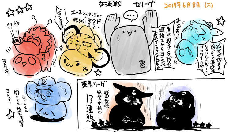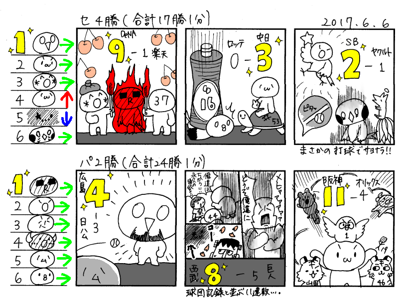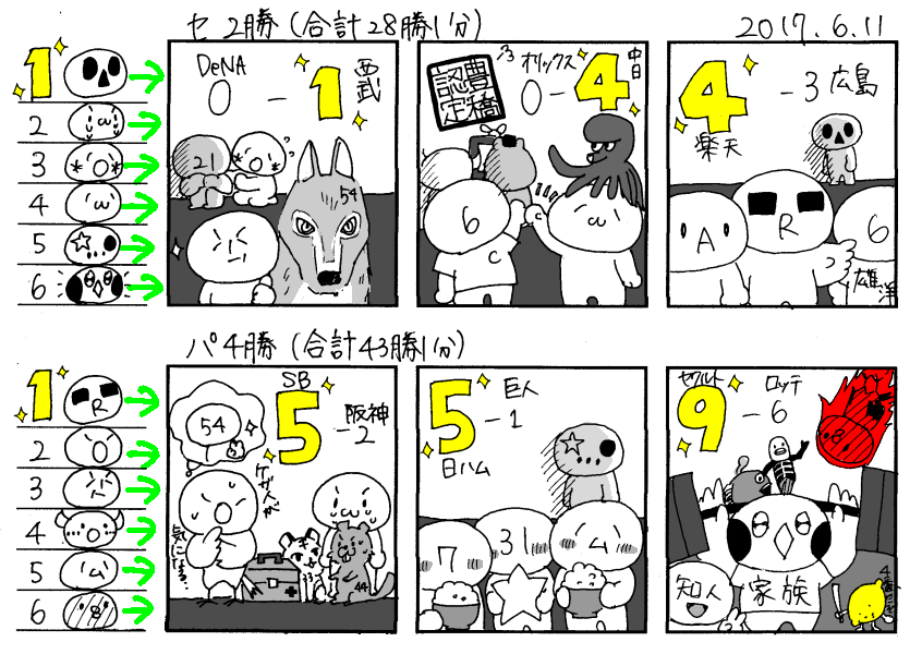 6/11(日) ロ 6-9 ヤ 日 5-1 巨 ソ 5-2 神 オ 0-4 中 楽 4-3 広 西 1-0 D