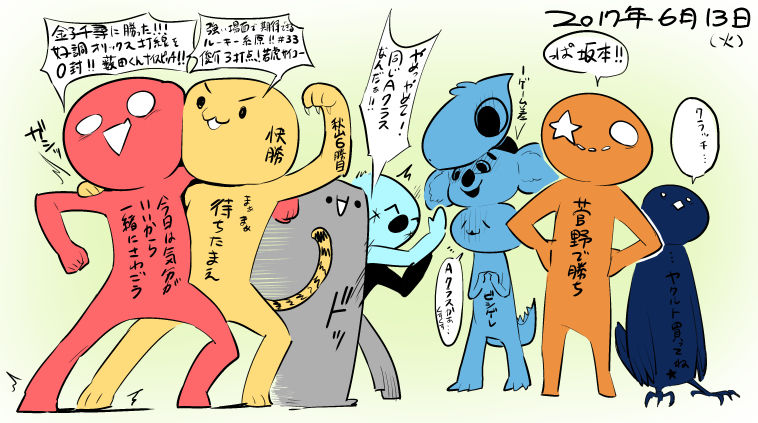 6/13(火) 巨 5-1 ソ 中 7-5 日 神 7-2 西 広 1-0 オ ヤ 3-12 楽 D 1-8 ロ