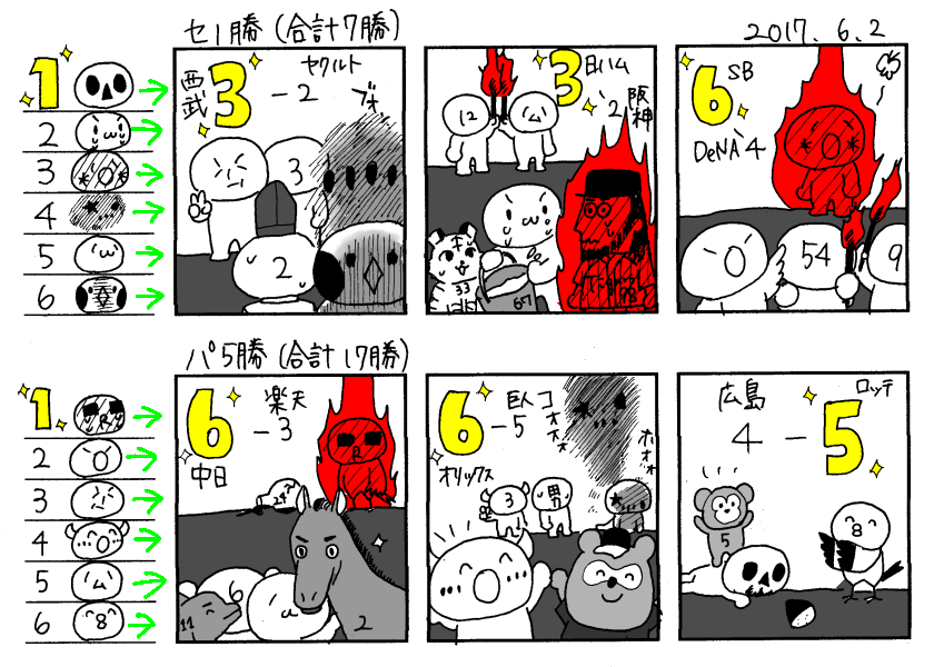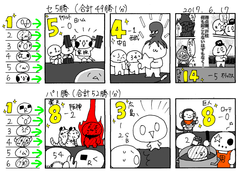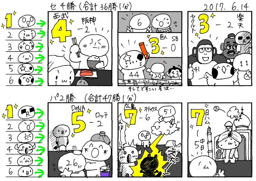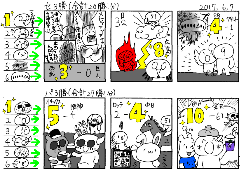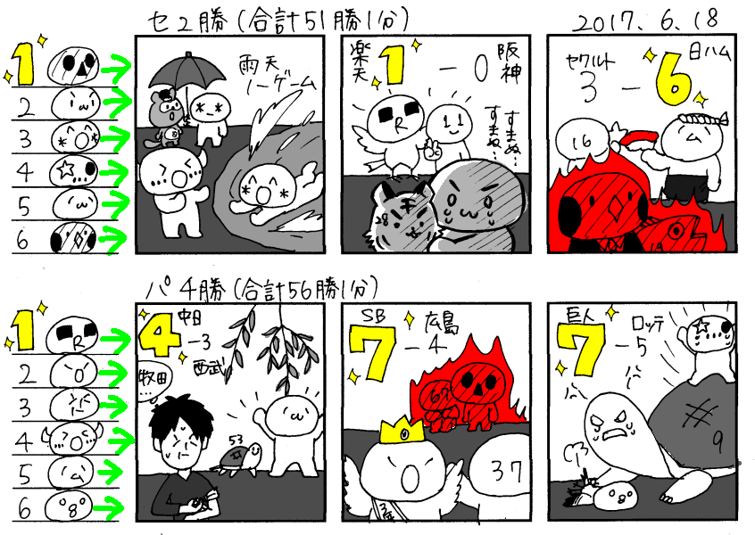6/6(火) ロ 0-3 中 日 3-4 広 ソ 2-1 ヤ オ 4-11 神 楽 1-9 D 西 8-5 巨