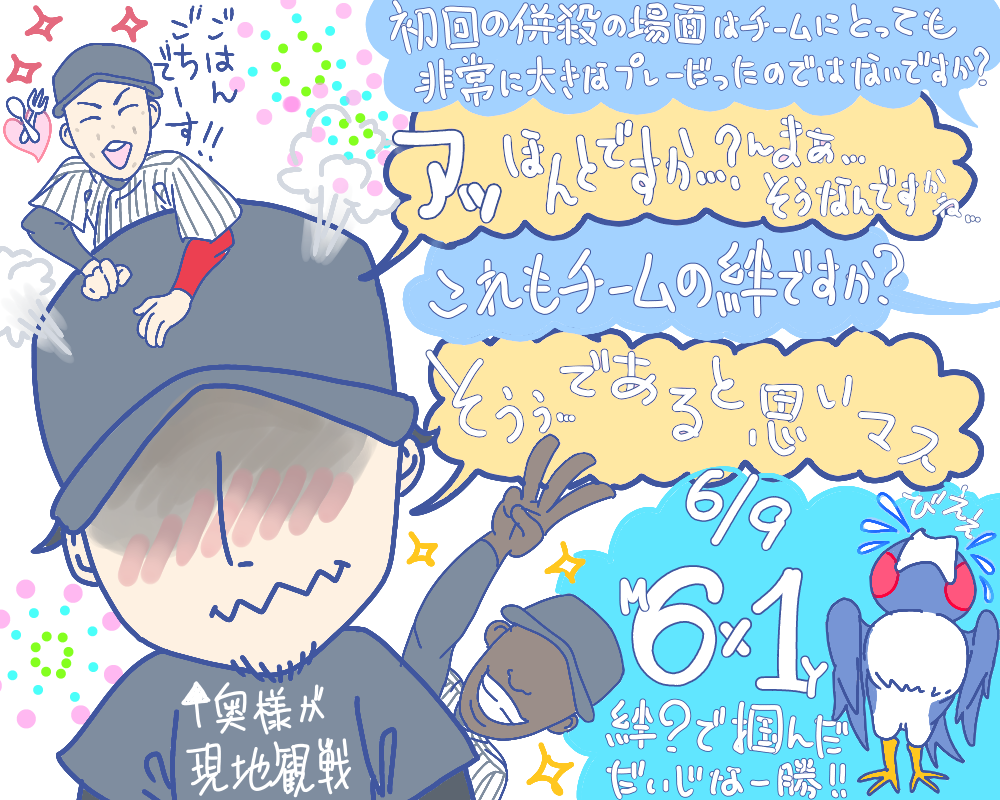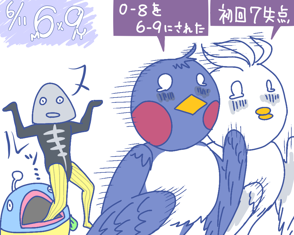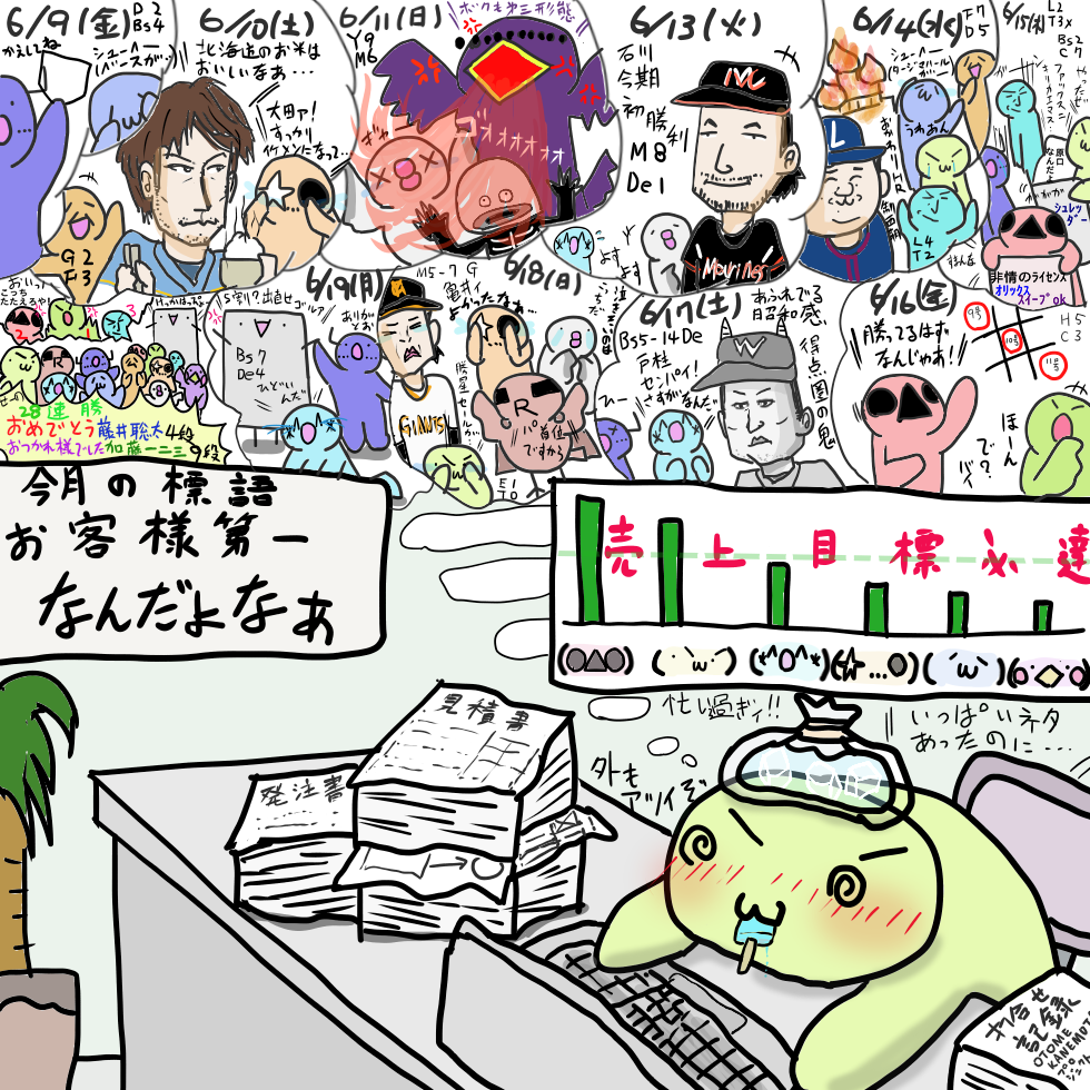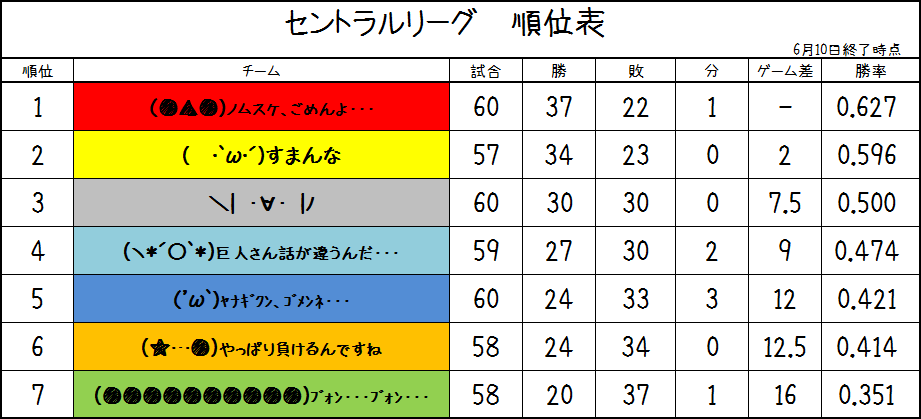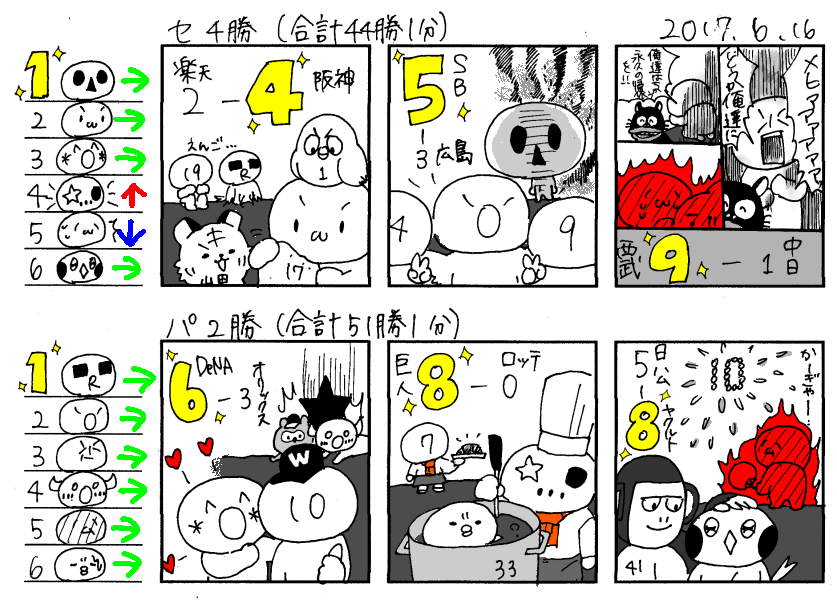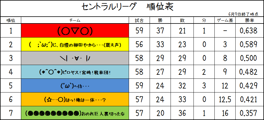 6/9(金) ロ 6-1 ヤ 日 1-2 巨 ソ 3-0 神 オ 4-2 中 楽 3-12 広 西 3-4 D
