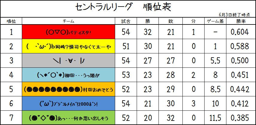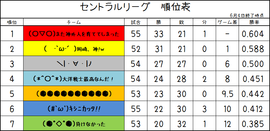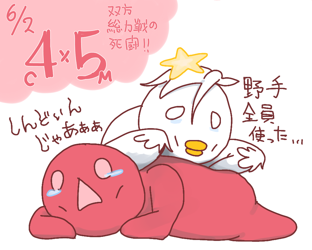 6/4(日) 巨 1-3 オ 中 2-0 楽 神 4-3 日 広 7-1 ロ ヤ 8-8 西 D 5-3 ソ