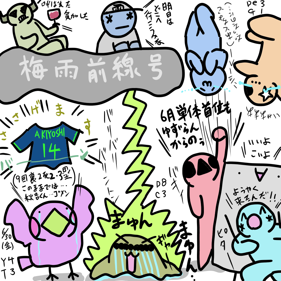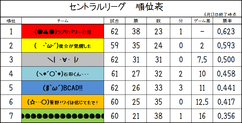 6/14(水) 巨 3-0 ソ 中 5-7 日 神 2-4 西 広 7-6 オ ヤ 3-2 楽 D 5-2 ロ