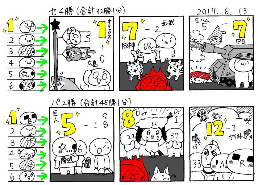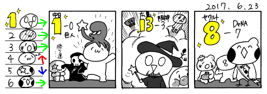 6/23(金) 巨 0-1 中 広 13-3 神 ヤ 8-7 D 日 7-3 楽 ソ 10-0 西 オ 3-9 ロ
