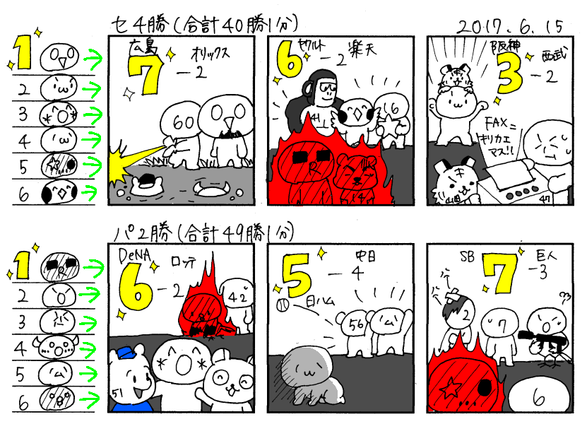 6/10(土) ロ 4-1 ヤ 日 3-2 巨 ソ 1-5 神 オ 5-3 中 楽 2-1 広 西 6-2 D