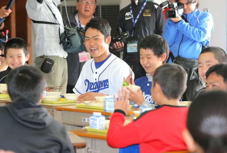 中日のドラフト1位・根尾昂内野手(18)=大阪桐蔭高=が13日、沖縄・読谷村立喜名小学校を訪問し、6年生約80名と給食交流を行った。