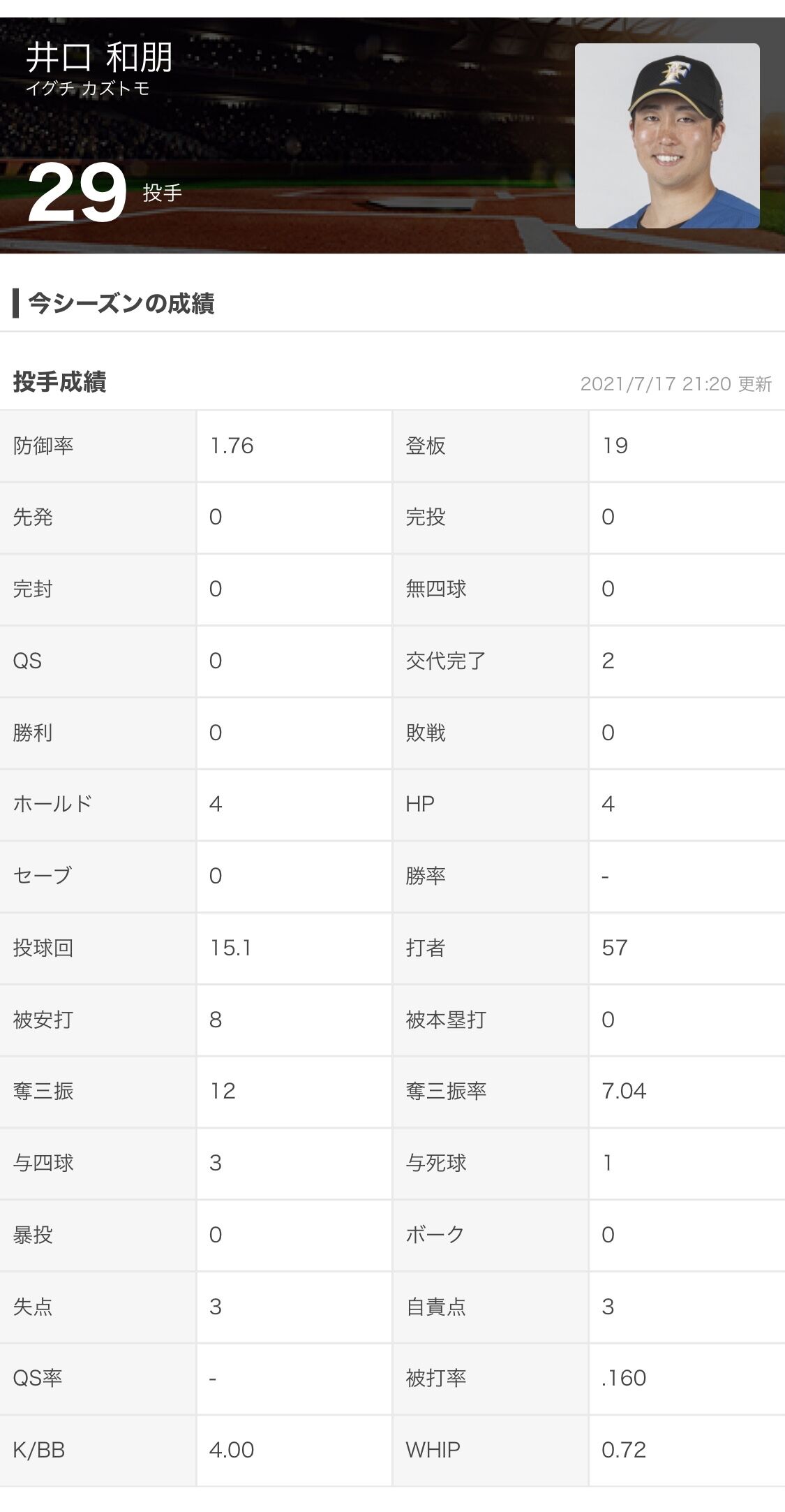 「被害にあったのは、入団6年目の投手・井口和朋(27)です。東京農業大学在学中にユニバーシアードで活躍後、2015年にドラフト3位で日ハムに入団。1年目は中継ぎとして37試合を投げるなど活躍を見せました。その後、試験的に先発に回るなどしましたが、今は中継ぎとして落ち着いています。派手さはないものの、今季も19試合に登板し、防御率1.76とまずまずの結果を残しています」(同)