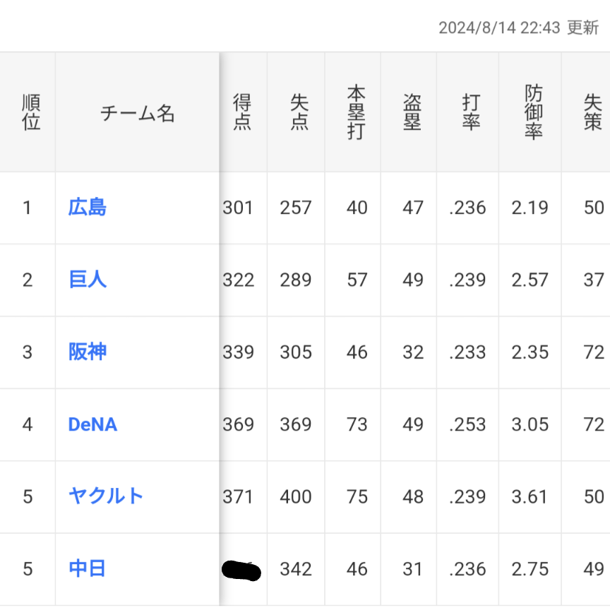 交流戦明けなら1試合平均4得点くらいはしているだろうから5試合で+20得点で巨人と同じくらいになるか