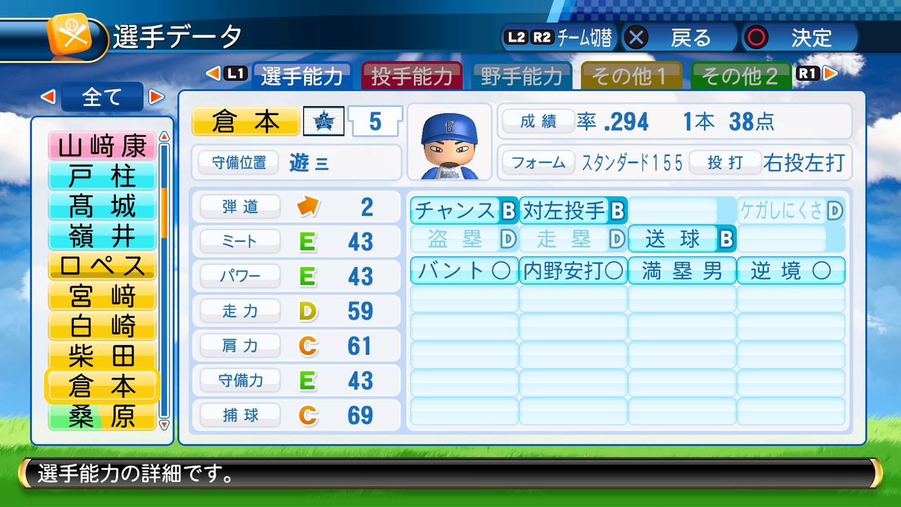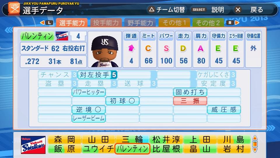 弾道2ミート55パワー62走力75肩55守備68捕球32